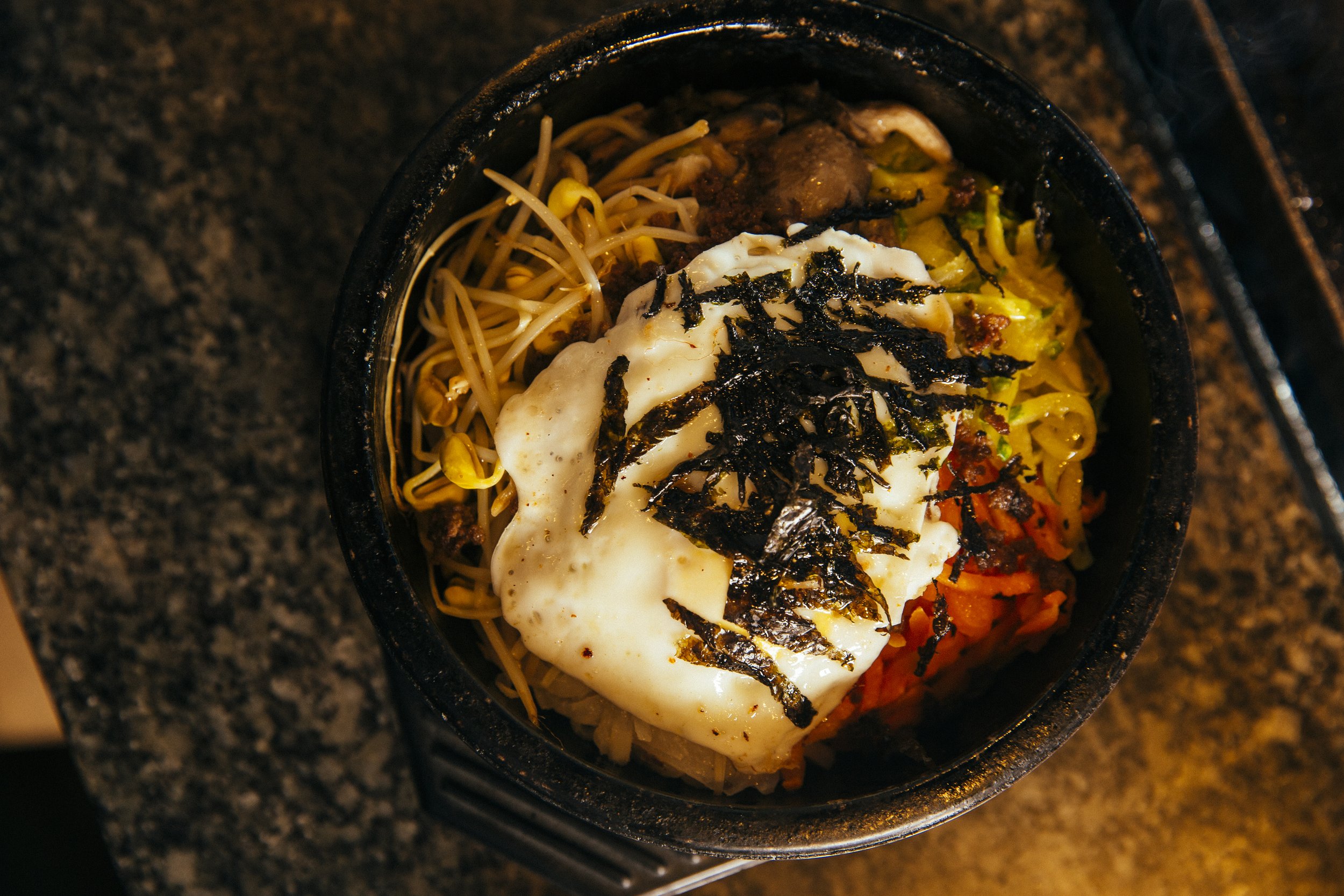 Arroz, Kimchi, legumes, carne moída, ovo mole e manteiga, servido na panela de pedra. (*arroz incluso na